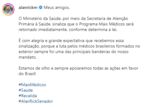 Tão logo a notícia foi divulgada nesta quarta-feira, o senador eleito pelo Acre, Alan Rick (UB) comemorou a volta do programa Mais Médicos em uma publicação nas suas redes sociais.
