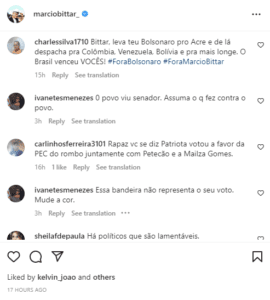 Veja abaixo algumas das opniões de seus seguidores. Pelo tom dos comentários será difícil para ele sustentar-se como um político de extrema direita, ao mesmo tempo em que faz acenos generosos ao presidente eleito Lula.