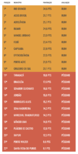 Os resultados demonstram que, apesar de ocuparem os primeiros lugares, Rio Branco e Assis Brasil apresentam nível “ruim” com 36,4 e 26,7 pontos, respectivamente. Dentre os 22 municípios avaliados, 10 obtiveram nível “ruim” e 12 apresentaram nível “péssimo”. Nenhuma prefeitura se enquadrou em “regular”, “bom” e “ótimo” (veja o quadro a seguir). A avaliação varia de 0 (pior resultado de transparência e governança) a 100 (melhor posição).