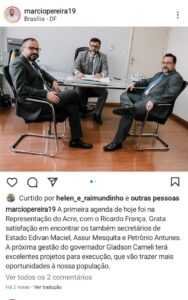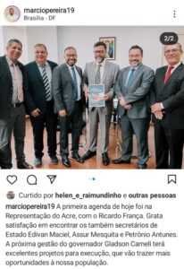 Em visita ao gabinete do senador Sérgio Petecão, em Brasília, Marcio Pereira afirma que foi até o senador “apresentar nossos projetos para os próximos anos”. Em outra publicação do secretário, desta vez no escritório de representação do Acre em Brasília, Marcio Pereira afirma que “ a próxima gestão do governador Gladson Cameli terá excelentes projetos para execução” .