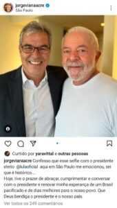 Na legenda, que marca também o perfil de @lulaoficial na rede, o ex-senador do Acre afirma: “confesso que esse selfie com o presidente eleito aqui em São Paulo me emocionou, sei que é histórico… Hoje tive o prazer de abraçar, cumprimentar e conversar com o presidente e renovar minha esperança de um Brasil pacificado e de dias melhores para o nosso povo. Que deus bendiga o presidente e o nosso país”