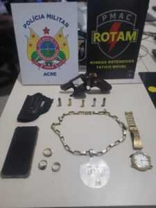 Primeiro fato ocorreu no bairro Cadeia Velha, em Rio Branco. Militares de Rondas Ostensivas Tático Móvel (ROTAM) apreenderam um revólver calibre 38, durante patrulhamento de rotina realizaram abordagem a um homem de bicicleta. O homem foi preso por porte ilegal de arma de fogo.