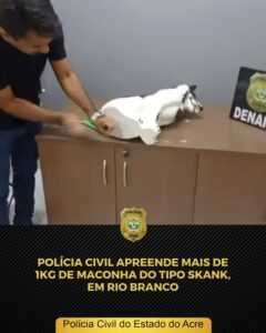 Na tarde dessa quinta-feira, 1, a Polícia Civil do Acre, por meio da Delegacia de Repressão ao Narcotráfico – DENARC, com apoio do Núcleo de Operações com Cães – NOC, apreendeu 1,5kg (um quilo e meio) de material entorpecente, maconha modificada (Skank).