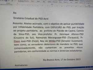 A direção regional do PSD no Acre acolheu um movimento da base do partido para expulsar detentores de mandato que praticaram infidelidade partidária nas eleições deste ano. Um abaixo assinado criado por filiados de Rio Branco e alguns municípios do interior, pede à direção do partido que aplique as penas previstas no estatuto da legenda, com expulsão e perda de mandato daqueles que apoiaram candidaturas que estavam foram do arco de alianças do PSD no Acre.