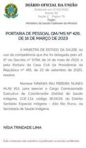 O Diário Oficial da União desta sexta-feira (17) publicou a primeira nomeação para cargo federal no Acre, desde que teve início o novo governo de Lula. Trata-se de Ninawa Inu Pereira Nunes Huni Kui.