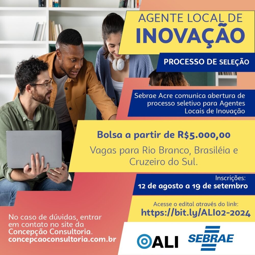 Estão abertas as inscrições para o projeto Agentes Locais de Inovação (ALI) do Sebrae no Acre. O edital 002/2024 prevê a cessão de bolsas de estímulo à inovação, nas regionais do Baixo Acre (Rio Branco, Senador Guiomard, Acrelândia e Bujari), Juruá (Cruzeiro do Sul, Mâncio Lima e Rodrigues Alves) e Alto Acre (Brasiléia, Epitaciolândia e Xapuri).