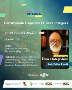 O destaque desta edição será a palestra do renomado filósofo e escritor Luiz Felipe Pondé, que abordará temas relacionadas à ética e integridade. Segundo a assessora de Controle, Processos e Compliance do Sebrae no Acre, Adriana Souza, o seminário é destinado a empresários de pequenas, médias e grandes empresas; gestores públicos e de instituições sem fins lucrativos, além de representantes de diversos setores da sociedade acreana e colaboradores do Sebrae. “Será um momento para reflexão sobre a importância da integridade, as oportunidades e desafios no dia a dia das instituições, bem como a troca de experiências do setor privado e público na implementação de uma cultura organizacional que preza pela transparência e integridade”, afirmou.