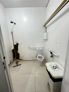 Na enfermaria, os pacientes se revezam no uso do banheiro do quarto destinado ao isolamento, devido à insuficiência de instalações sanitárias. O outro banheiro, mais distante da enfermaria, não oferece privacidade, pois suas divisórias não possuem portas. Além disso, as poucas portas existentes não têm trancas, o que obriga os usuários a trancar a porta principal para utilizá-lo, inviabilizando o uso simultâneo por mais de uma pessoa.
