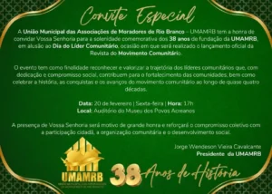 A União Municipal das Associações de Moradores de Rio Branco (UMAMRB) comemora quase quatro décadas de história com uma solenidade especial nesta sexta-feira (20), às 17h, no Museu dos Povos Acreanos. O evento, liderado pelo presidente Jorge Wendeson Cavalcante, marca os 38 anos de fundação da entidade e deve reunir lideranças de diversos bairros para celebrar a trajetória de lutas e conquistas do movimento comunitário na capital.